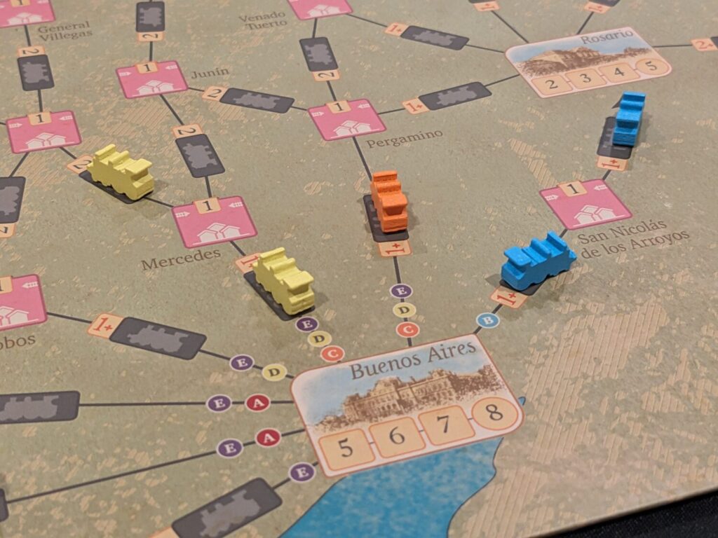 There is one change to the Development system with the La Pampa map—Buenos Aires always has to be the most valuable city on the map. That means all railroads (since all railroads start in Buenos Aires) get a minor bump three times during the game, whereas other Metro Areas may develop more slowly. Also, there are five Metro Areas on the La Pampa map, whereas the base game’s map had only two.