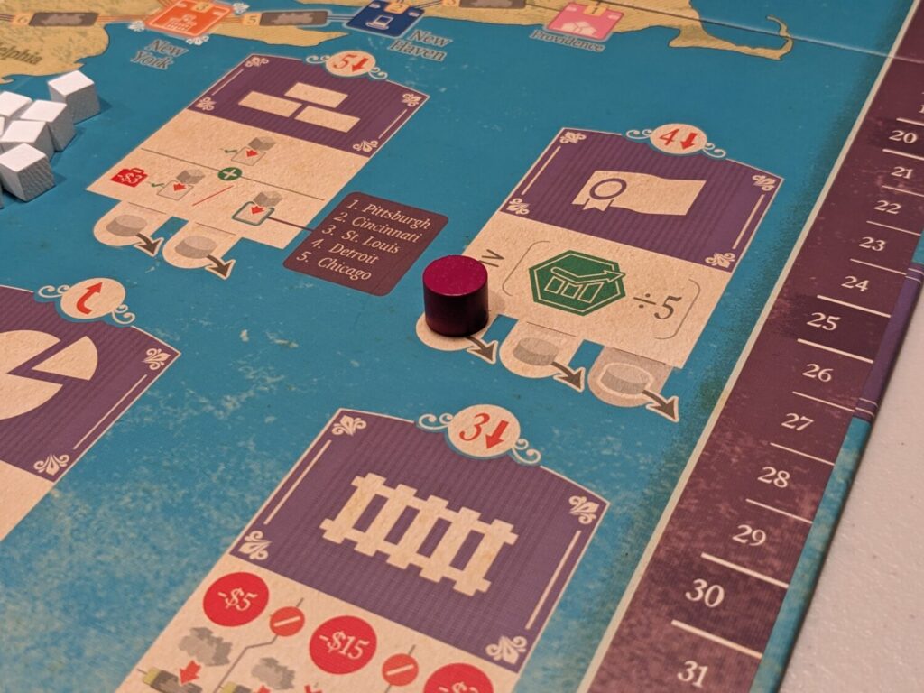 The routes on the Allegheny map are also intriguing. Pittsburgh is the signature “Metro” location here, and three of the five railroads can conceivably reach it on their very first build action. But every route has a way to reach pay dirt around the map, and there’s a lot of sniping early on as corporations get in each other’s way. The early game in Allegheny is very strong, and when combined with the extra boost to everyone’s income potential (the development locations outside of Metro areas are also very valuable), there seemed to be many more opportunities for a nice payday.