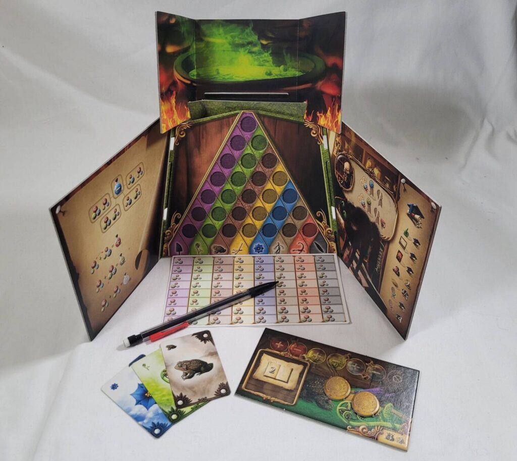 Mounted on the inside of the player screen is the deduction board. It’s triangular in shape and features seven differently colored diagonal stripes. At the bottom of each stripe is an ingredient—purple mushrooms, green ferns, brown toads, yellow chicken feet, blue flowers, tan mandrake root, red scorpions, and black feathers. Inside of this triangular structure are circular cutouts where tokens can be placed. These cutouts are placed at the intersections where imaginary lines drawn from each ingredient towards the apex of the triangle would meet. Mounted above this is a secondary screen that has a little shelf on it. This is used for combining ingredients using the smartphone app.