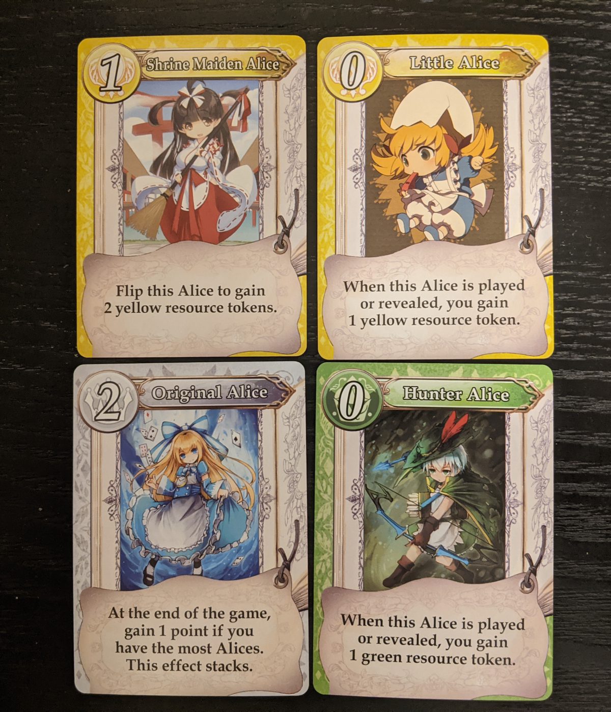 Summoning these cards has a cost, which is related to your yellow slot. This slot represents the “dream power” and you can play an Alice card as long as the number of yellow cards is equal to or less than the cost (e.g. cost 2 card requires 2 yellow cards). If you don’t have enough, you can top it off with your yellow tokens. We’ll get to those tokens in a bit.