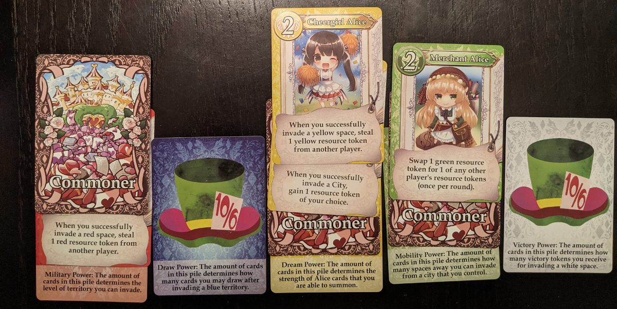 With a system like that, this will lead to a situation where you cannot play any card. As an option, you can play a card face-down rather than face-up, making it a Commoner, and draw a new card. The card still counts for that slot, but it will impact your end game scoring. Besides scoring points for area control, you also score points for having the most Alices in each slot. Even more problematic, you can only have 4 cards in one slot, and you can’t remove a card once it’s been placed.