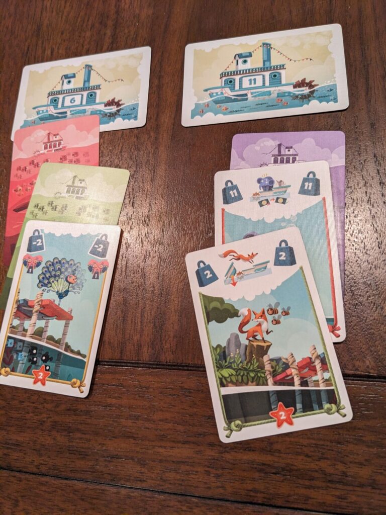 And during that first game of All Aboard!—featuring five players, three of whom were under the age of 12—that was absolutely the case. During each resolution phase, we were constantly going back to the rulebook to figure out what each card did, and in what order. Players didn’t always remember to start their turn with a three-card hand, to ensure they had a full suite of choices. At five players, one person doesn’t get the chance to go first…and going last in a round of All Aboard! is terrible, from a strategy perspective, because that means you only have one boat to choose from with your card play.