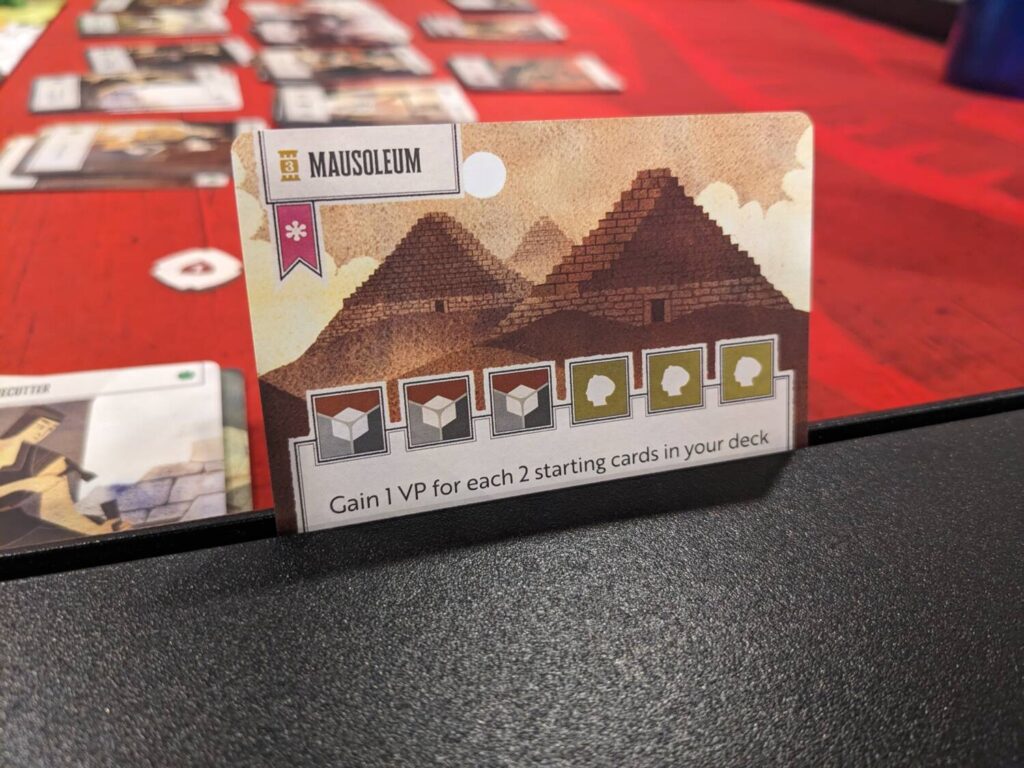 The cards in the market? Always the same 11 cards, with no overtly special or game-breaking items. The top 1-2 cards of a deck for the six “special” cards (the upgraded warrior cards, the upgraded building cards, and two cards used to either store resources or produce a wild building resource) score end-game points for their owner when acquired, at the cost of one additional resource. It’s just enough to push players towards a minor race to grab a few of those cards.