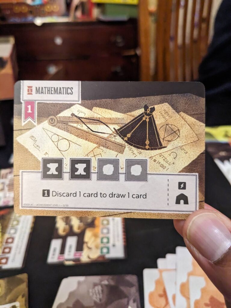 This gives the game legs, although in a strange twist, there are enough copies of the same technologies for all players. That means that all players might eventually be able to build the Mathematics tech. One could race to grab a tech before another player, but in my games, the bronze (level one) technologies are often in everyone’s tableau by the end of each game.