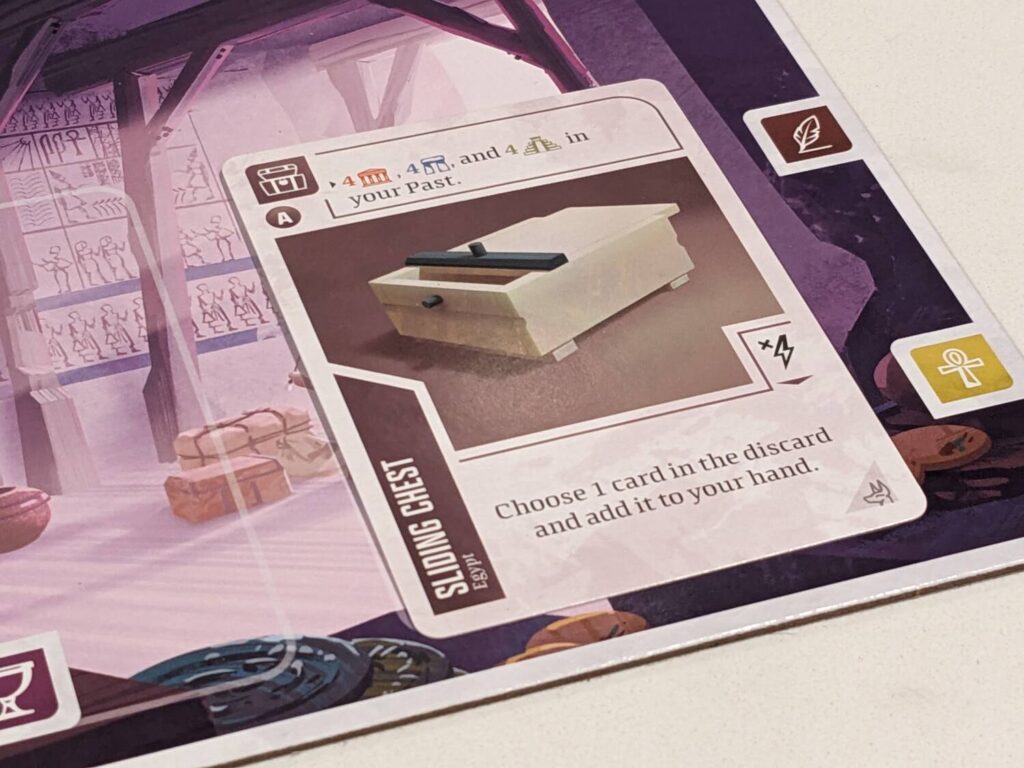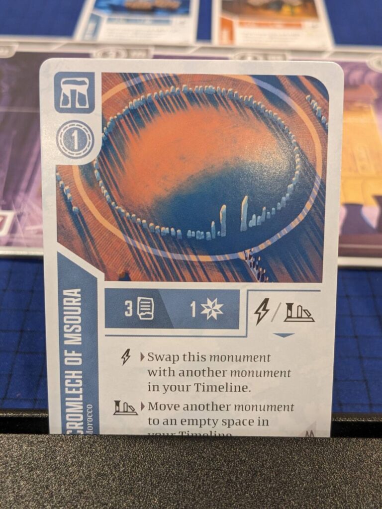 The only “major” thing this expansion adds is a dedicated solo mode. Here, players have two choices. The first is Challenge Mode, using a 15-card deck that adds a number of goals to each game so that solo players have something specific to chase—monuments of a certain suit, monuments left on the Timeline, etc. The top half of these cards are objectives that take up space on the artifact track, and must be achieved by the end of a player’s 16th turn. The bottom half of challenge cards show a one-time benefit, and in each scenario, players begin the game with at least one of these benefits ready to go.