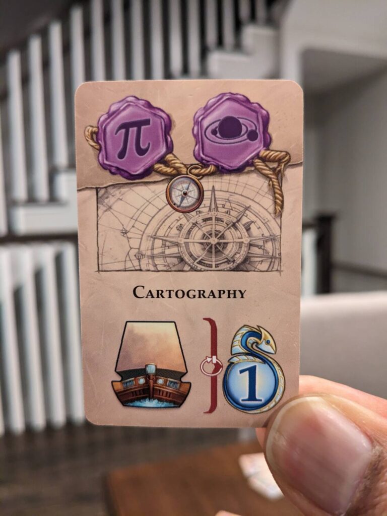 Atlantis Exodus is a mixed bag from a graphic design perspective. In an attempt to keep some components, particularly the Influence cards, language-free, the game relies a bit too much on icons that needed to constantly be referenced in the rulebook. (The small player aid cards don’t help as much as nature, or the designers, intended.) Sometimes, you won’t have an issue—yep, that icon means take a purple reference book; yep, that Knowledge card for end-game scoring clearly means that ships are worth an extra point. But other times, such as the Monument scoring tiles or the way each meeple type scores during mid-game scoring phases, the iconography was a miss. The English translation for the rulebook is only OK, so there were some minor stumbles even when icons needed to be deciphered during play.
