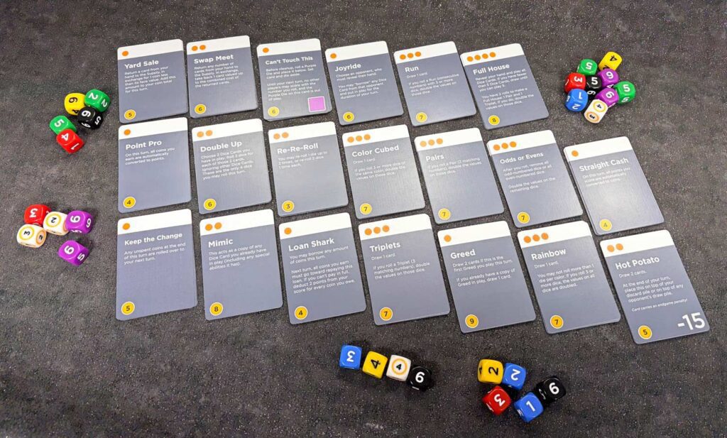 Most of the action cards give you ways to manipulate the dice you’re rolling. The Pairs action card says, “If you roll a Pair (2 matching numbers), double the value of those dice”. That’s great if one die is money, or a black 6. The Point Pro action card says, “On this turn, all coins you earn are automatically converted to points.” That’s great to have near the end of the game when coin dice become almost worthless because you just want points. The Keep the Change card says, “Any unspent coins at the end of the round are rolled over to your next turn.” This is great because you could choose not to spend any coins that turn and hope for a high income next round.