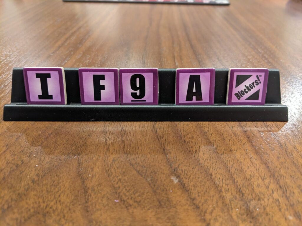 Blockers! is a 2-5 player abstract strategy game. To win, players must try to score the least amount of points. Over a series of turns, each player will place one of the five tiles in their hand onto the board. (Each player has a Scrabble-style tile holder for convenience, but we found that some players preferred to keep their tiles in their hands.) The main board is a 9×9 grid with nine rows lettered A-I, nine columns numbered 1-9, and nine blocks of areas demarcated by various symbols (hearts, spades, etc.). These areas often cross over, providing flexibility in tile placement.