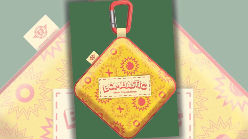 Bombastic is the second release in Bitewing’s series of travel games, after the charming Trailblazers and before the upcoming Gazebo. I must confess to being enamored of the cases for these games. Those rounded corners, the pleasant plumpness, the choice of a bright and contrasting color for the fabric around the zipper; it’s all good. You look at Bombastic on the table, or clipped to someone’s backpack, and you can’t help but want to look inside.