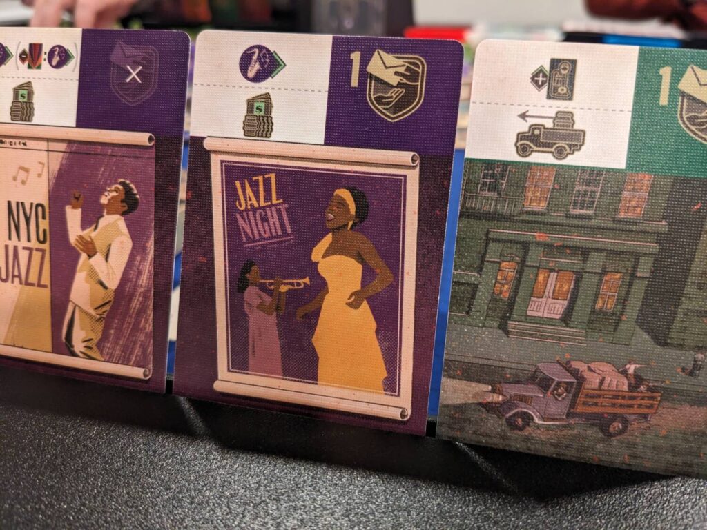 The games that do work well? Anything that only features a board, but no personal player boards. Card games of all shades. Medium-weight Euros with smaller-than-normal boards when you do two- or three-player game nights. Tile-laying games like Wispwood worked great, as long as the topper was on and players could spread out to build their 6×6 grid of tiles.