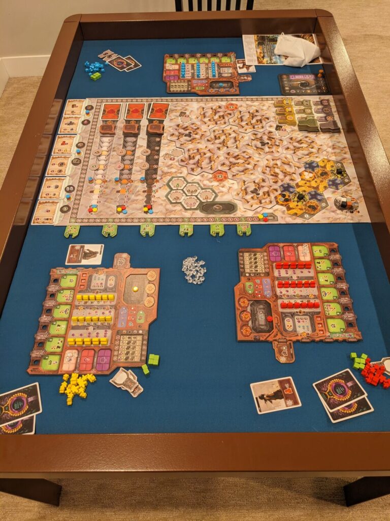 Another major issue for me is the size. The Ironside 2.0 just isn’t big enough for most of the heavier games I table. The Great Library, the Lacerda coming in 2026(?) I couldn’t even get the game board and the player boards for a three-player game night into the recessed area of the table. Perseverance: Castaway Chronicles—Episodes 3&4? Not possible, even with just two players. Covenant? Not happening. This is similar to the size issues Andy had when reviewing the Firefly Board Game Table.