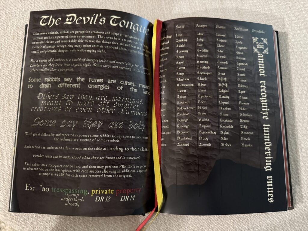 The Devil’s Tongue section also stands out to me as a way that the author, Peter Hauschulz, showcases the level of detail and thought that went into this world. Rabbits are smart creatures, and they are able to piece together the cryptic runes of the Lumbers—our words and alphabet—despite not being able to speak the language. There are certain words that the various classes would be familiar with, affording the chance to roll difficult checks to perceive the rest. Those Danger High Voltage signs? I’m sure the Warlock would be able to recognize those and provide ample warning to the herd. Especially since the Seedwhiskers condemn anything Lumber related and don’t know any runes.
