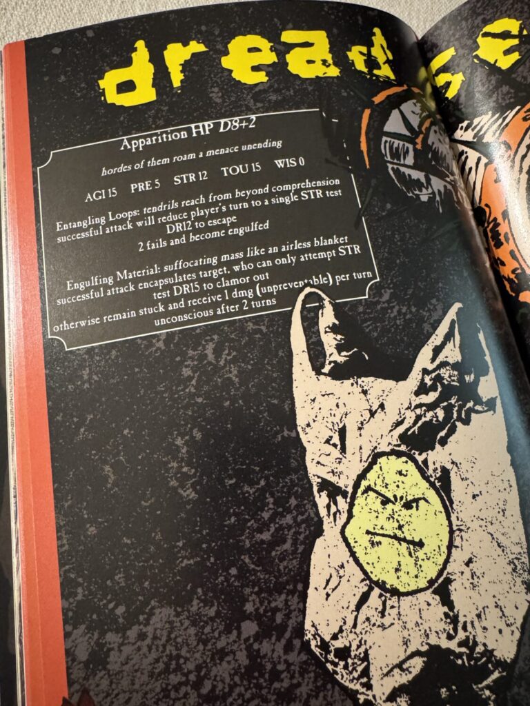 There are portions of the book that feel unrefined, like the re-use of art—the Scrapper art is used twice—and some of the maps in the adventure that look messy with their broad, spray-painted outlines. There are some errors, notably in the Devil’s Tongue section that mentions Scamps understanding the word ‘Trespassing’ when ‘Private’ is the word that’s actually in their table. It’s rough around the edges, but I can overlook those things for the sake of the ambiance and tone lying between the covers.
