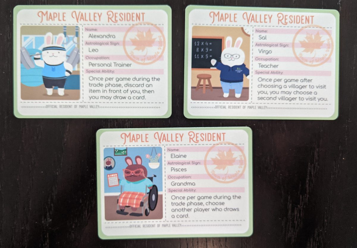 When I opened the prototype copy of the Bunny Party at Maple Valley, I didn’t see the components or a rulebook; what I saw was a ‘Travel Guide.’ This Travel Guide highlights the various places in this fictional village such as the Funny Bunny Cafe or Big Leaf Park. On the back of the Travel Guide is the Daily Hoot, explaining the origins of a prestigious party in this small village. Was I playing a heavy euro game? Is this a legacy game? No, it’s a 20-minute card game.