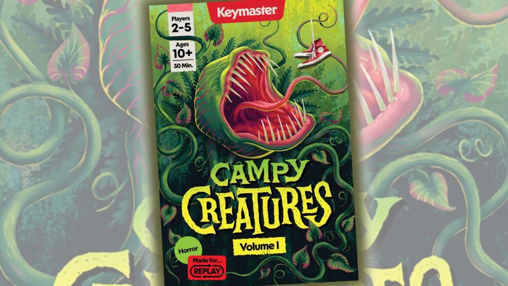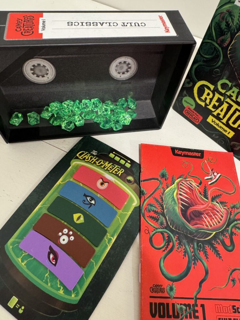 I should never be surprised at the quality of a Keymaster game, but I was still impressed by the presentation from the moment I opened the Campy Creatures: Volume 1 box. Translucent green Energy tokens, wooden Clash Markers, and evocative art sell the theme in spades. The box is styled like a vintage VHS tape, and the Volume 1 designation hints at the intent to turn Campy Creatures into a multi-title series featuring different movie genres.