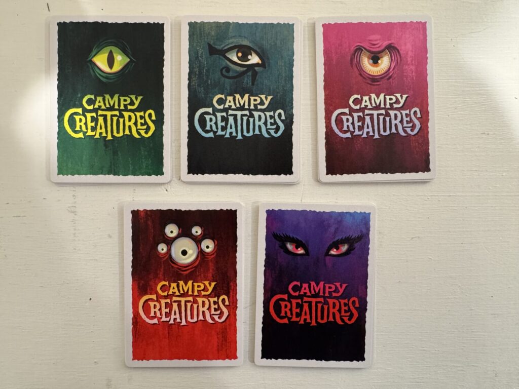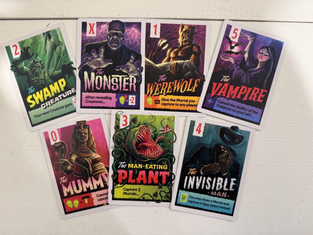 Creature abilities make all the difference in Campy Creatures: Volume 1. Cards like the Vampire allow you to cancel out the ability of the Creature to your left. The Man-Eating Plant allows you to take two Mortals instead of one.The Werewolf gives you an Energy token or lets you give your captured Mortal to any player, often hitting them with negative points.