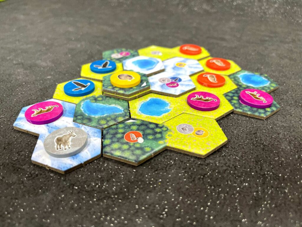 Unlike in the original game, where players earned points for largest groups of terrain, in Cascadia: Alpine Lakes players are trying to get animals to the 3rd level of tiles (or higher), where they earn points for each animal type thus placed. The player with the most animal of each type at level 3 or higher earns additional points.
