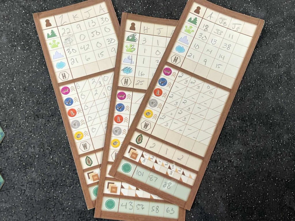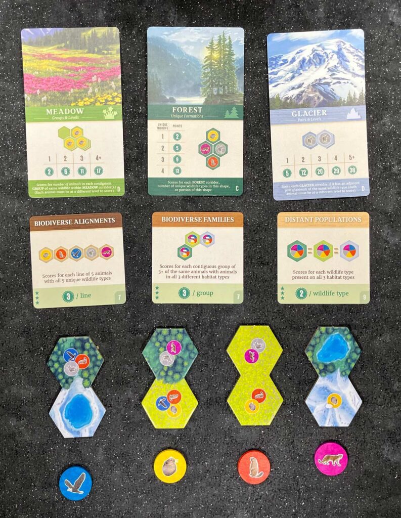There are fewer terrain types: forest, meadow, and glacier; and scoring cards are now limited by type instead of by animal. This means that you can score for cougars, or eagles, but those animals have to be within the confines of one terrain type in order to score. However Cascadia: Alpine Lakes also includes an advanced mode, with environment scoring cards which allow players to earn points across terrain types in addition to the base scoring cards.
