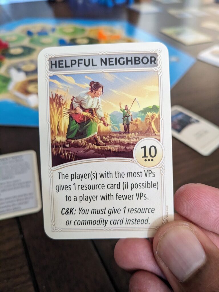 In reality…I didn’t mind it. By building on a hex with a two or a twelve, I knew that at least once for each number, that was gonna mean production, which isn’t a bad thing. The event cards are sometimes no events at all—those cards are titled “A Beautiful Day”—and sometimes they are “Good Neighbors” cards that require each player to pass a resource card to the player on their left. This, plus the die results, provided for light amounts of drama each turn.