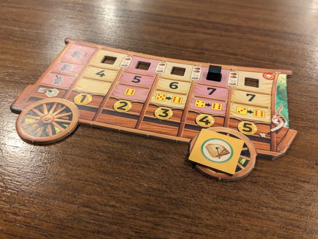 Traders & Barbarians—the scenario—is a fun twist on the CATAN system. This scenario adds a pick-up-and-deliver variant that adds a cute wagon token to each player’s supply, along with a wagon board, which shows the current strength level of the wagon token along with its movement ability and rewards granted for each delivery.