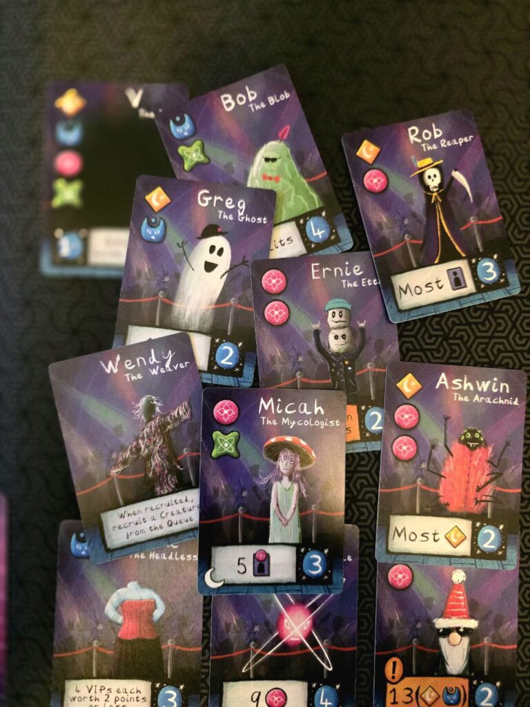 Club Spooky plays over three rounds and revolves around bidding on VIPs (named creatures with scoring conditions) and Randos (background clubbers with a single trait). Players sway creatures in the lobby by bidding “talking points” tokens in hopes of convincing them to join their clique. You can outbid others by placing one more token than they previously did, which gives the lower bidder all of their bidding pieces back. If your tokens remain the top bid by the start of your next turn, that creature joins your tableau.