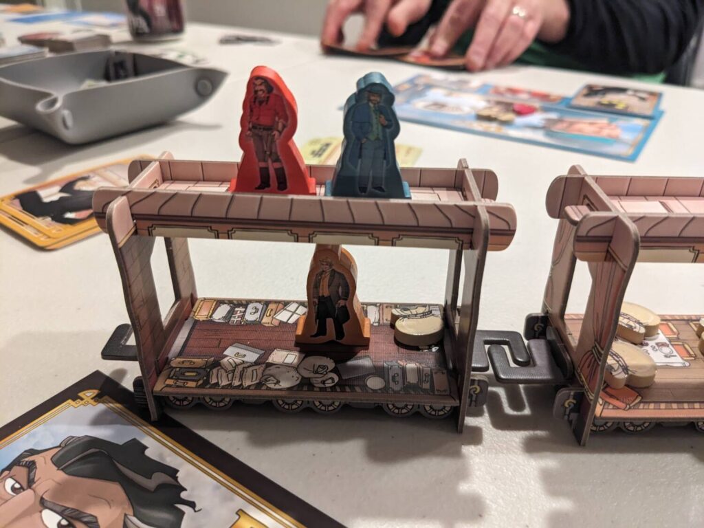 The team at Flat River Group sent a review copy of Colt Express Big Box, so over the course of about six weeks, I used Colt Express as the filler for my review group sessions. (I also squeezed in two plays on Board Game Arena, to refresh myself on the gameplay.) In this way, we could play the game a lot while also slowly implementing expansion content into each play.