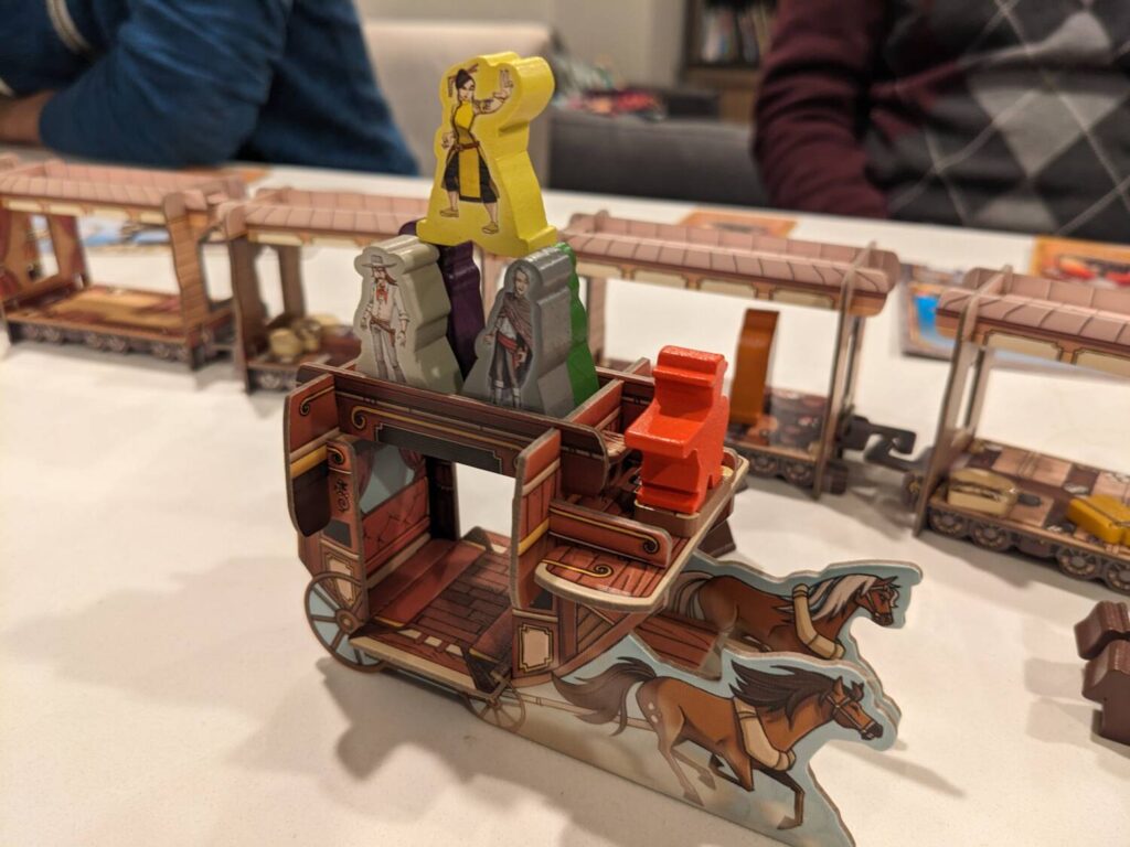 The main additions offered by the first expansion, Horses & Stagecoach, start with the introduction of the “Horse Attack.” No, players don’t attack the train with their horses, they ride in during setup to give players the choice of which car to place their bandits. That also means we get cute wooden horse meeples that rest alongside the train and can be used by bandits to move around the train using a transportation method beyond the roof of the train.