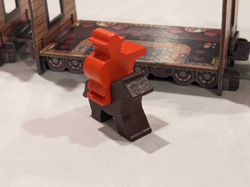 When a bandit boards the Stagecoach (by either using a horse to ride into the Stagecoach, or jumping from the roof of the train to the roof of the Stagecoach), that bandit also has to take on a hostage which (usually) slows them down a bit with some sort of negative power for the remainder of the game. In exchange, each hostage is worth end-game cash to the associated bandit. Because there is one less hostage than the number of players, it’s a bit of a race to get a hostage early on, but the payout can sometimes be variable, so that helps mitigate the urgency.