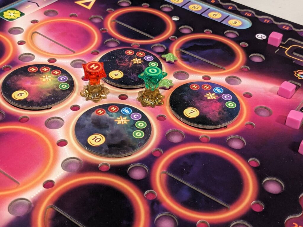 I don’t think Crafting the Cosmos is difficult, but its ruleset does create a number of edge case questions. Scoring an energy track on each player’s board? Easy. Getting the right number of resources, based on where all of the main board’s energy trackers reside after each player’s actions? A little harder. Getting the movement rules just right for proto and advanced life tokens, versus stars? Also, a little harder.