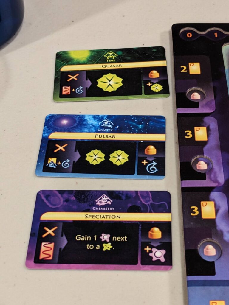 As it happened, I had already played Crafting the Cosmos twice on BGA to ensure I had the rules down, and immediately after we finished that in-person play, I hopped online to play it again. Some of the games I table nowadays give me that feeling, especially the games that seem to lean hard into a “multiplayer solitaire” design format. Despite the fact that I was physically sitting with three other people while playing Crafting the Cosmos at my home, it never felt like we were playing it together, if that makes sense.