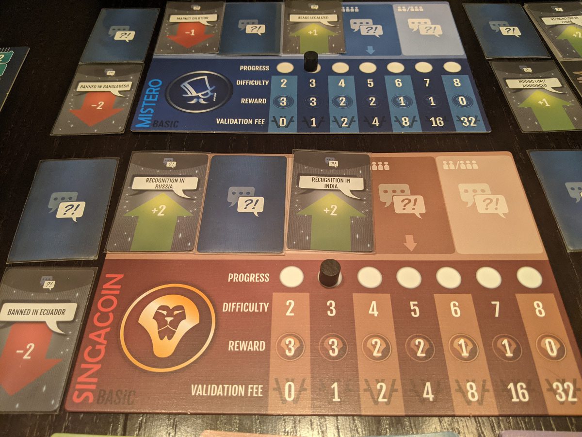 Mining is the most complicated part of the game. Each Cryptocurrency has a track that displays the difficulty of the mining as well as the payouts. There is also a stack of gold cards with a cryptocurrency logo on them, representing the public interest.