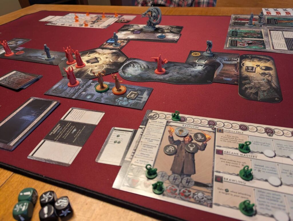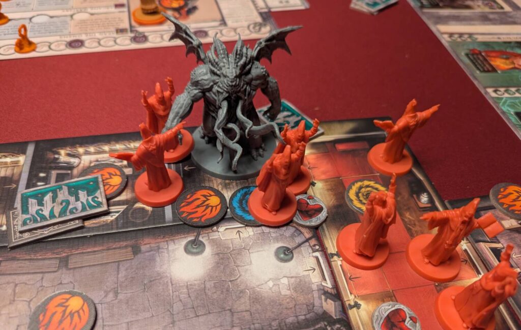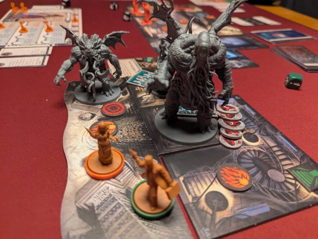 It can already be difficult–because of the grey, blue, and black palette of the board–to determine where one room begins and another one ends. When a small room with space for about 3 standard figures is suddenly filled with 8-10 investigators, monsters, and an Elder One, it becomes even more problematic trying to keep track of which are actually involved, especially if the room next to it is also filled to capacity. Larger and more clearly defined game board pieces for each room would help alleviate this.