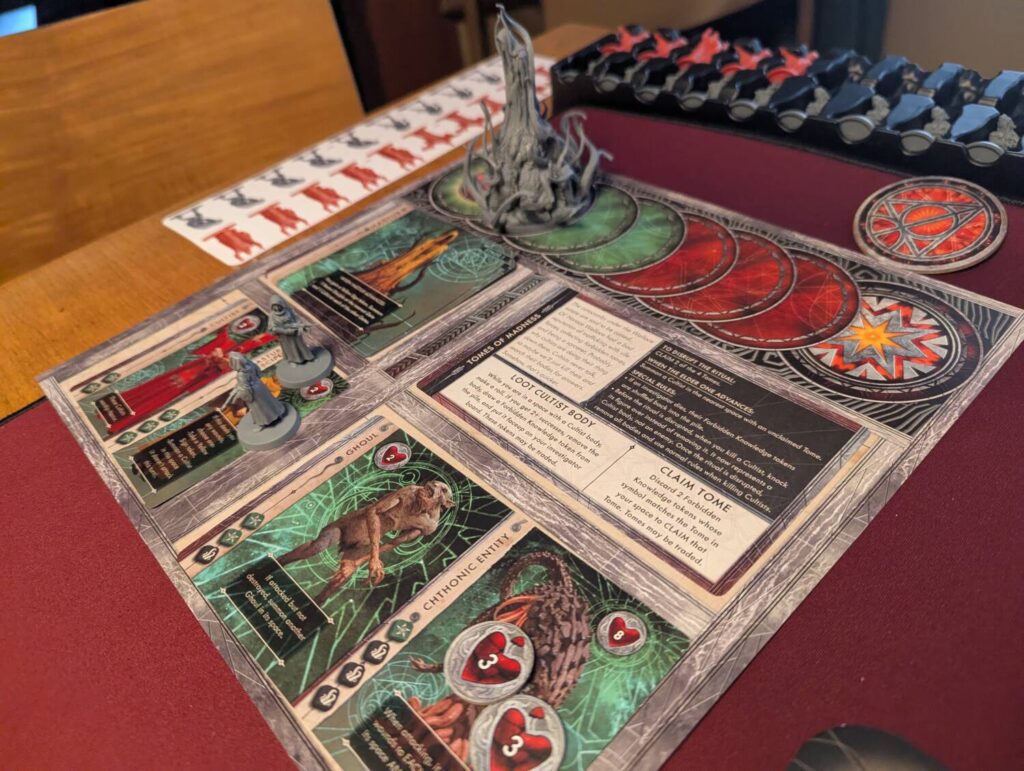 Unsurprisingly, coming from a publisher called Cool Mini or Not, all the cultist and monster figures are incredibly designed. It’s always fun to bring a new one onto the board and spend a few moments to check out all the little, grotesque details. Those who enjoy painting minis will have a blast with this game. Several are also very large, however, and this can lead to one of the few issues I ran into during my playthroughs–many of the rooms are just too darn small.
