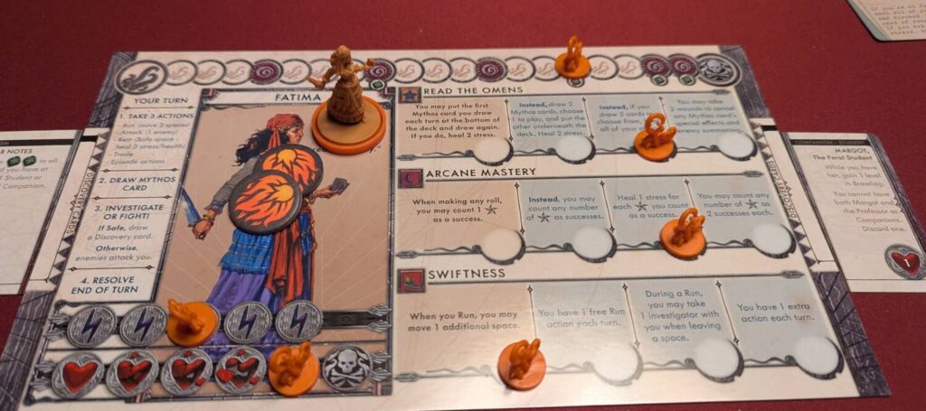 Additionally, the Elder One starts off the board and has his own track, and creeps closer to joining the party based on symbols on the Mythos Cards. This means that in a 2-player game you are given a bit more time to get to all the places spread out across the map that you need to disrupt the ritual before the Elder One comes onto the map. Having 5 players will help you get to those locations quicker, but it also means the map will be filled with even more enemies quicker as well, and it increases the chances of The Elder One showing up before you’re ready for them. Achieving this kind of player count balance without any variation in setup means less time in the rulebook and more time in the game.