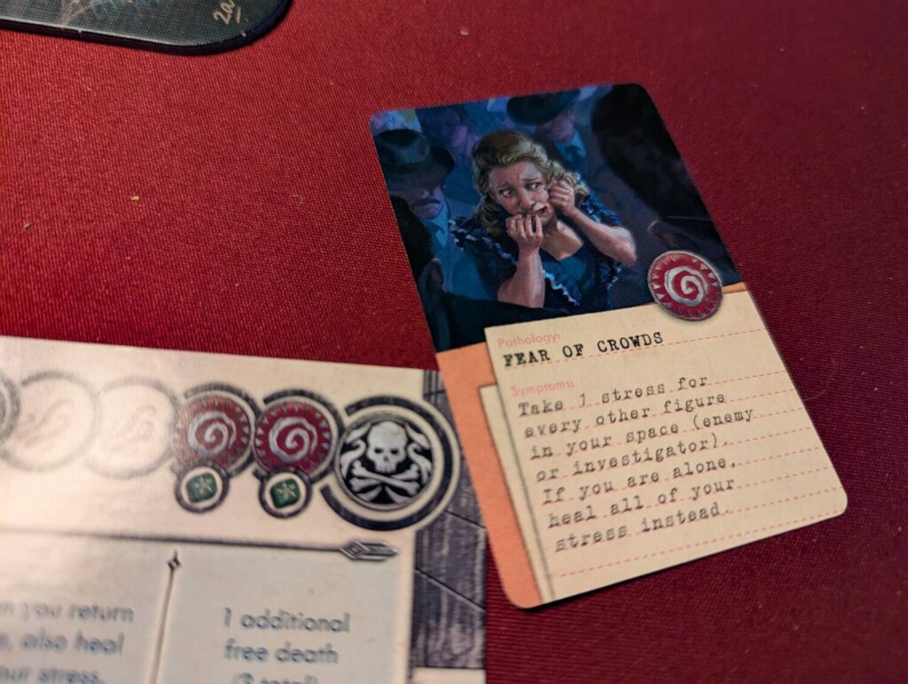 Based on gameplay rules, it all seems pretty standard for co-op dungeon-crawling fare, but what really sets Cthulhu apart is the insanity. You see, among the hits and misses on the dice, there are tentacles, which raises your investigator up on your Sanity Track. At certain points on this track, you will hit an insanity threshold, triggering your personal affliction (dealt out before the game) but it will also allow you to level up on one of your four skill tracks. This is really the beating heart (or pulsating brain) of the game.