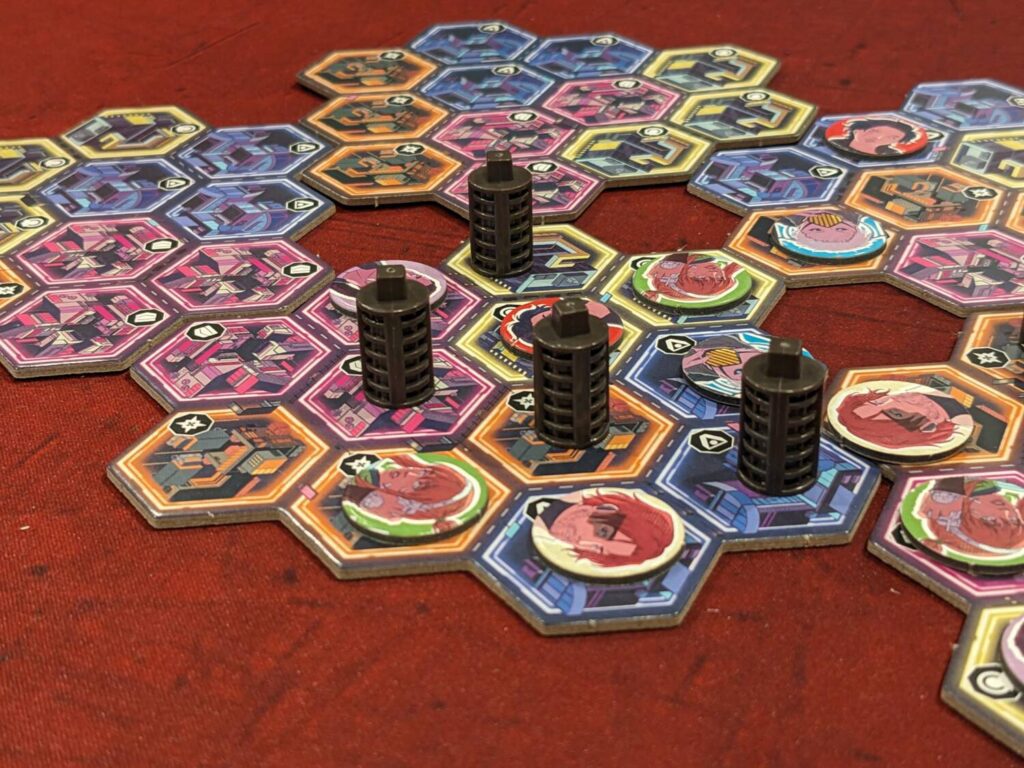 On later turns, players will remove crew tokens to build “waste tubes” of varying levels to seed an area majority mechanic on the three different levels of Stratos. (It’s also worth noting that players found themselves not as excited about joining the resistance movement of the future…especially if it means infiltration by means of climbing through city-wide garbage chutes. Also, I’m really hoping these waste tubes—brown in color—are only used to dump trash, and not human waste!)