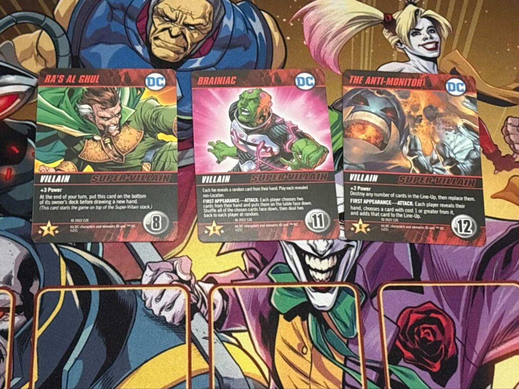 Defense cards are premium pick ups for any strategy, as players are not only avoiding Attacks from other players, but from other forces within the game: Super Villains. While players spend much of the game cycling through the Line Up’s offerings, gradually improving their deck’s quality and consistency, players’ primary goal is to defeat as many of the assembled Super Villains as possible. During setup, a stack of progressively higher-cost and higher-impact Super Villain cards is set to the side of the Line Up. These extra-powerful cards serve as both an outlet for players to use their accumulated Power and, as the game’s pace speeds up, a welcome source of gameplay disruption.