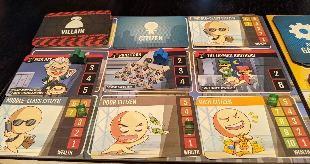 Across from these locals are the beloved villains such as the Ponzitron, the Layman Brothers, and Demonic Telemarketer. Each Villain has a Scam Value and Weak Points. The scam value is how much wealth they take away from the citizen across from them each turn, while the weak points are the numbers the Heroes need to roll on their dice.