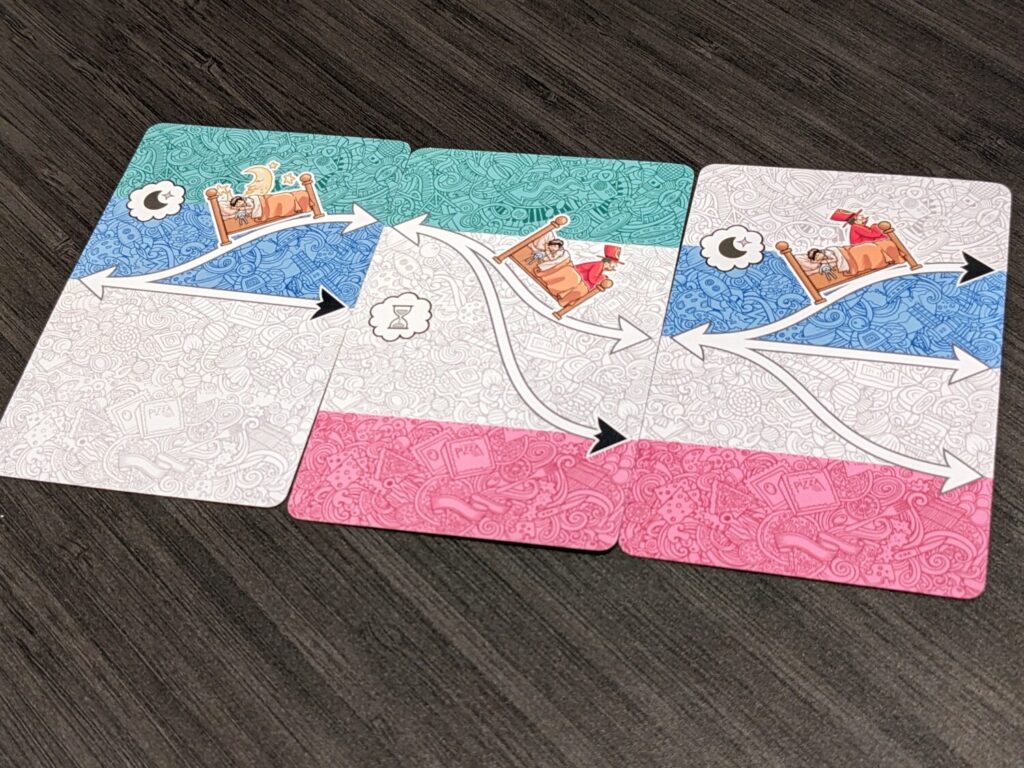 And yes, Deep Dreams is that kind of game: a somewhat stabby race to score the most points by simply playing cards to the table. In most cases (tied to player count), when someone has played 10 cards to the table, the game ends after everyone has had the same number of turns. Points are scored by building “Dream Groups”—the game’s term for placing cards that line up with the same color scheme—as each card lays out colors in different zones in a different order. It’s also important to line up each card so that the arrows running along the middle keep Bruno on the same “Sleep Path.”