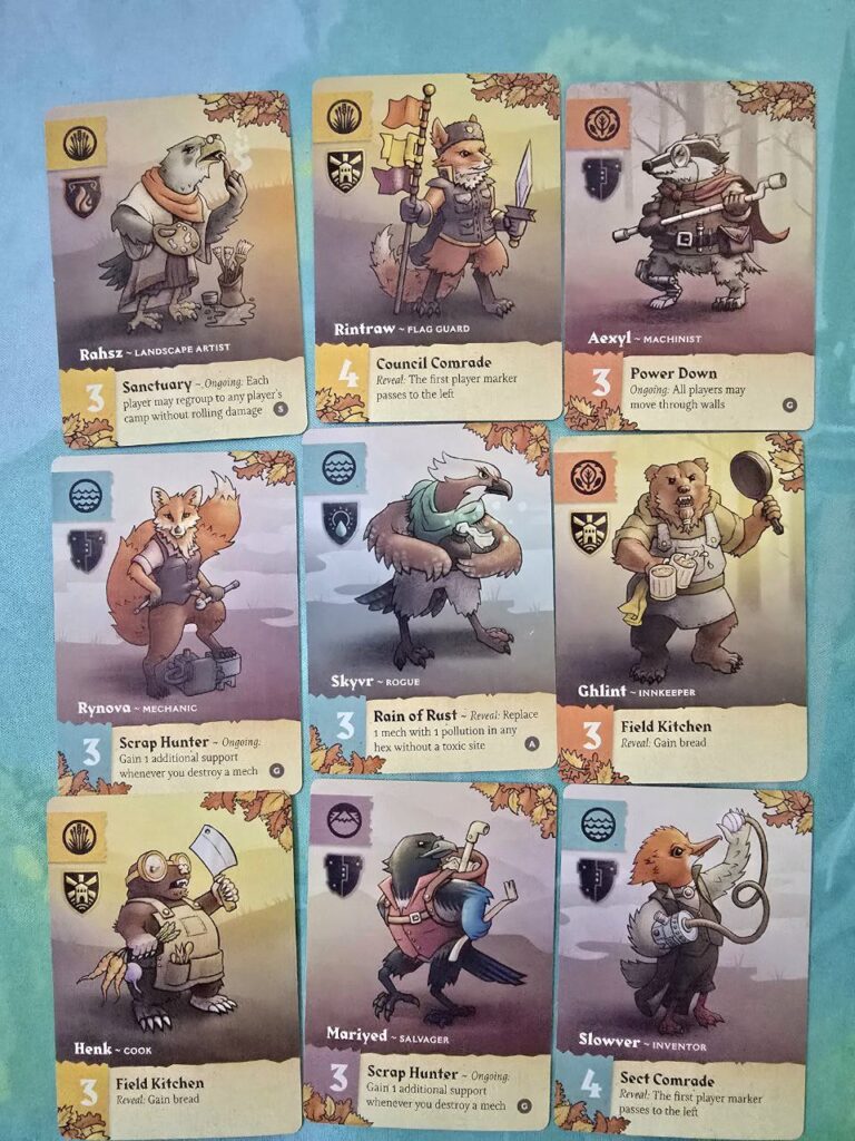 Defenders of the Wild plays in turns until either the success condition is met or one of the various defeat conditions occurs. Players collectively win if all factions have individually built all their bases and all factories have been “rewilded.” Conversely, players lose if two of the same defender types are killed, five factories are built, or six toxic sites are spread across the board. Each faction has a choice of two organizers, each with an asymmetric deck of defenders.