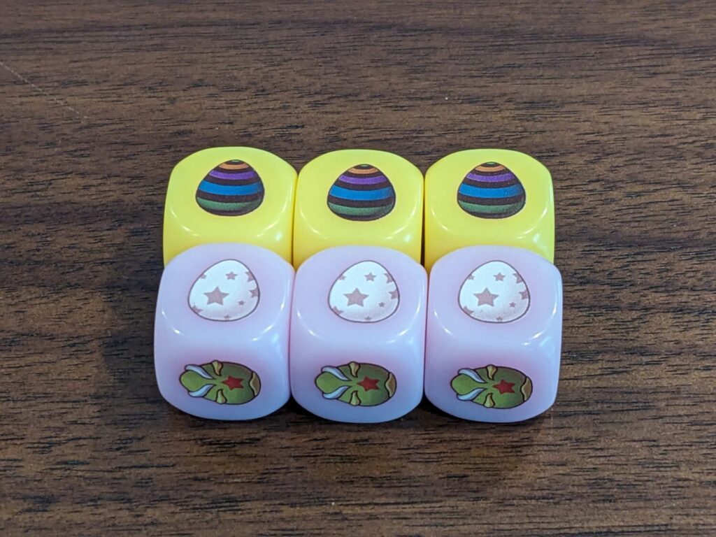 With that as our frame, I received a review copy of the game Dragon Clans (2024, Van Ryder Games) recently, and it was a very easy game to get to the table. That’s because my kids (ages 11 and 8) are always willing to chuck dice, Yahtzee-style, and it is because they are both Pokémon card collectors. In Dragon Clans, players take on the roles of dragon trainers who have to collect eggs and hatch “cute but fierce Dragons”, as the back of the box tells us. Those eggs are represented by dice, and using six dice and the three-roll mechanic mentioned earlier, players have to match die faces with face-up dragon cards in a shared card market.