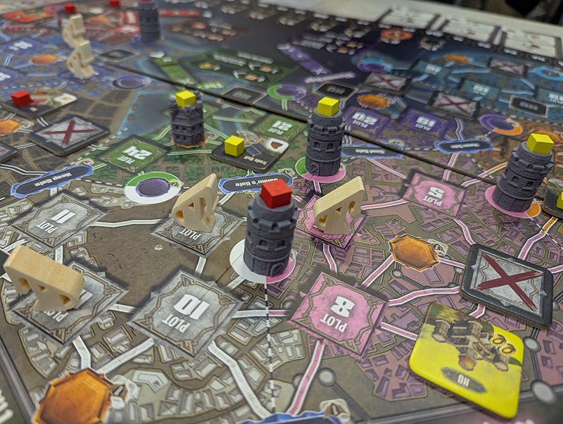 The frustrating thing is that the physical components are actually solid. There’s genuine satisfaction in watching the flat city board come alive as players add towers, gates, and buildings across the districts.