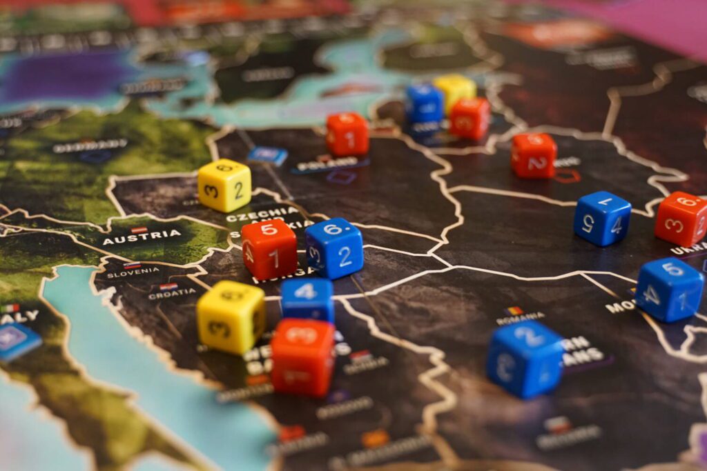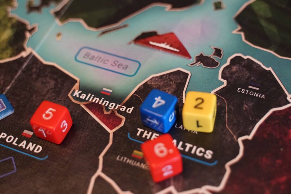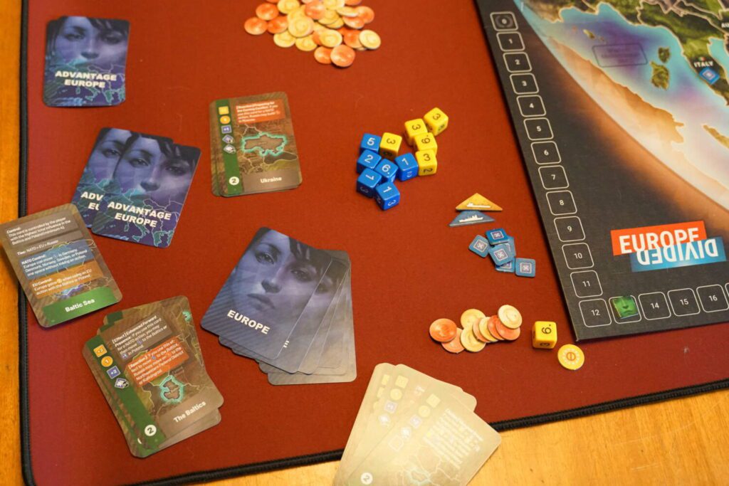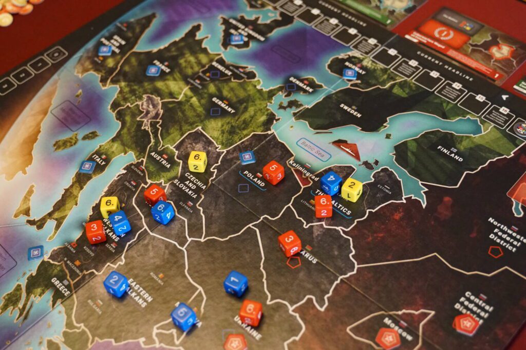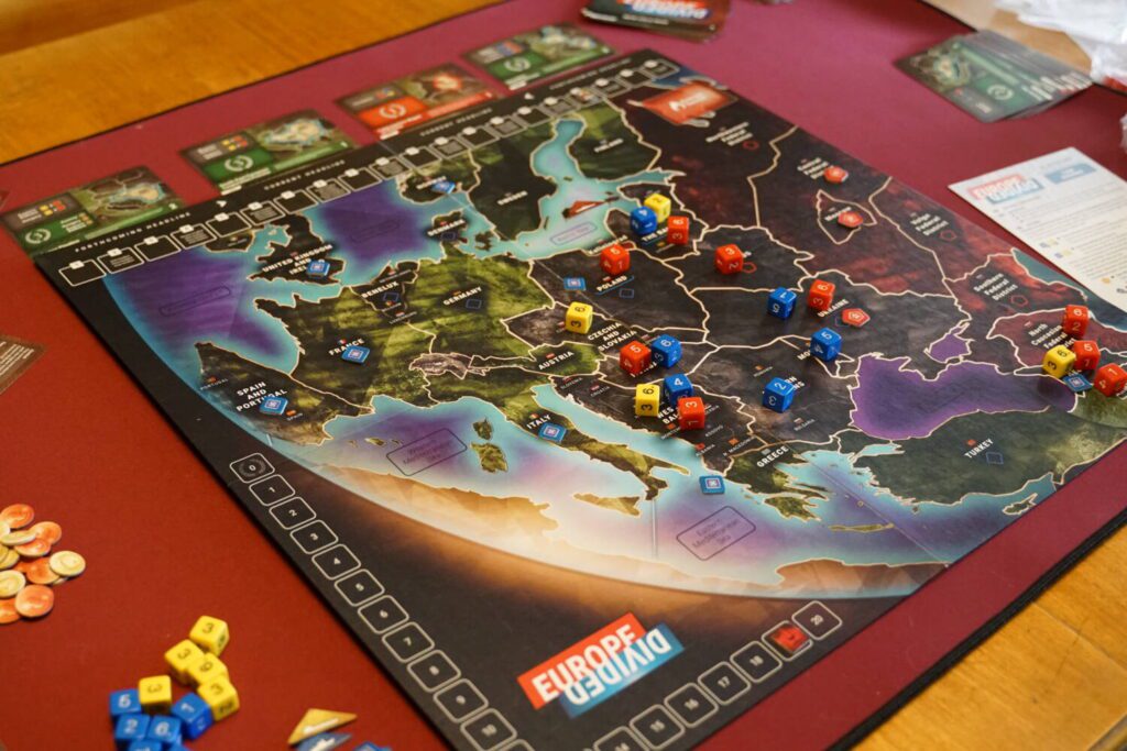 Europe Divided covers the post-Cold War period between 1992 and 2019, with players controlling either the Western Europe or Russia. Most of the continent is in a fragile state and both sides are looking to advance their influence (represented by sets of D6 dice) in the contested countries of Eastern Europe.