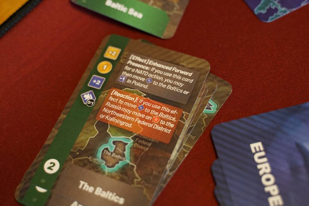 Despite each turn being straightforward, the rules (and the wording of those rules) are overly fussy. Actions cards can be used for normal actions or Special actions, which are listed as Actions, Reactions, and Effects. The fairly bland graphic design on the cards and the map don’t do it any favors, especially with colors: Europe is blue, the backs of their cards are all blue and their armies are blue, but sometimes Europe is also yellow, but their victory point marker and face-up card colors are green? You’ll spend a decent amount of time in the rulebook to decipher everything, especially if you are the Europe player.