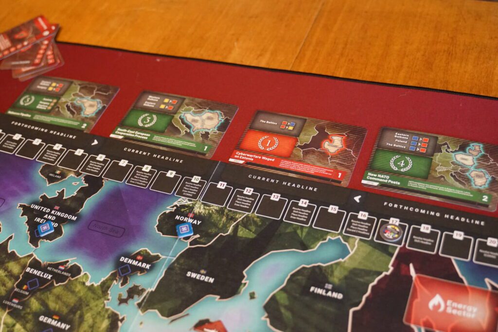 Outside of controlling each contested country, the other primary way to score points is through Headline cards. These are smaller objectives, each achievable by a specific player. Every other round two are scored, then replaced with a new one from each player, every other round. All Headline cards are shuffled together, so you might be stuck with only Headline cards of your opponent’s color to play from your hand of 3. While this adds a bit of extra strategy, the requirements on each tend to be easy enough to reach on a single turn—for example by having the majority influence in a specific country—and they wound up being far less critical than I anticipated. Since the goals for the next two Headline scoring rounds are visible by both sides, it takes a lot of the suspense out of that aspect of the game. Since they are only worth a few points each, it became simple enough to ignore many of them. Why would I spend two turns changing my entire strategy on the map for a measly 2 points?