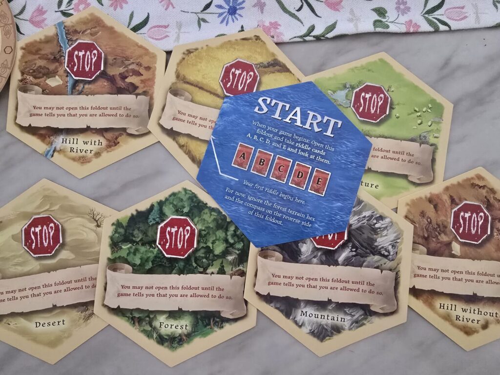 This will be a spoiler-free take on the puzzle. Players are new settlers on Catan, building out the game board with unfoldable paper hexes that replicate the board game’s familiar tiles. You’ll manipulate all parts of the game, including tearing and folding everything from cards to the manual to the game box itself. Answers are checked with a dial to match three codes and (hopefully) reveal the correct answer card. There’s a narrative story about the land of Catan, drip-fed through various puzzles. There’s also a hard ending with a nice surprise for Catan fans.