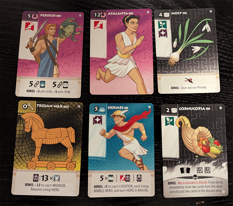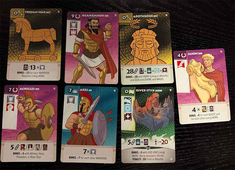 I must also mention that the theme is quite well-researched here. Even someone like myself with passing knowledge of Greek mythology can appreciate the combos, bonuses, and penalties making references to these great stories. For example, Hector scores a bonus if paired with Ares, Apollo, or Artemis, mirroring his allies in the Trojan War. The Trojan Horse requires at least two heroes and the “Clever” hero tag to score its bonus. If you’re a huge fan of the mythology, Fantasy Realms: Greek Legends is going to paint a smile on your face.