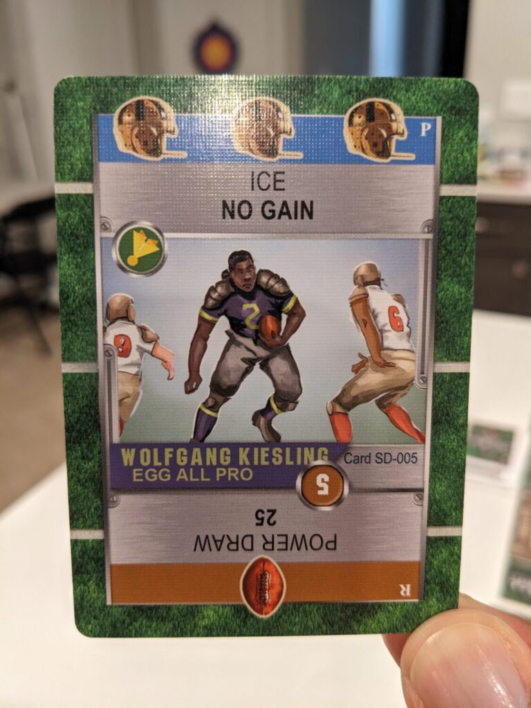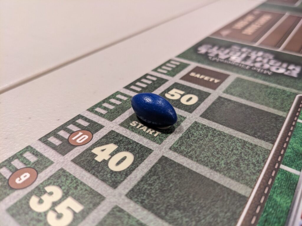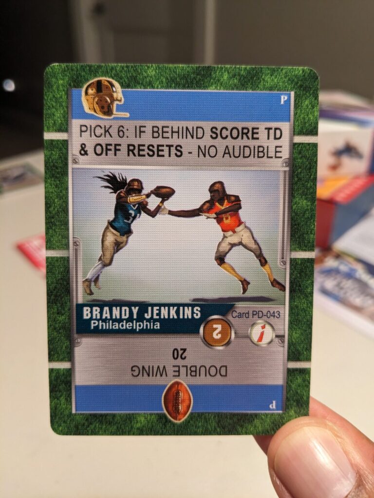 In Football Highlights: 2052, I found that the team decks were so balanced that most of the initial turns in each half were…kind of dry. I would play a 30-yard pass to the right zone of the field, then the AI would play a card that perfectly countered my pass play. (And in solo play, the bot is just top-decking cards, so even when it was guessing, my offense would get stymied!) In head-to-head play, Joseph would play a 20-yard run play up the middle, and I had multiple cards that could stuff the run or maybe make the offense lose yardage.