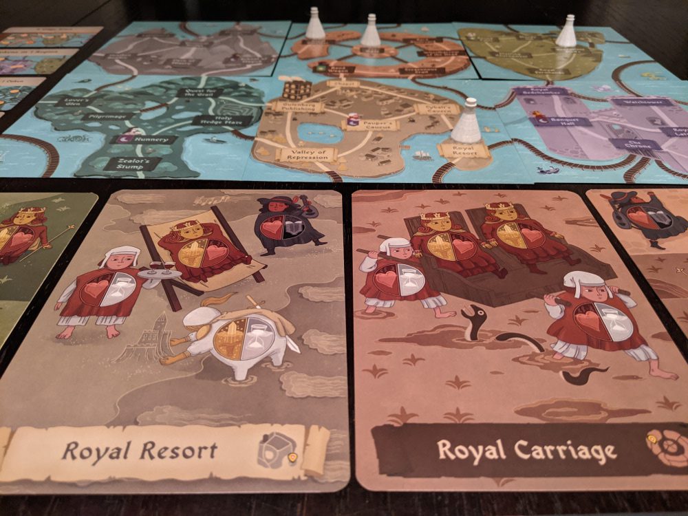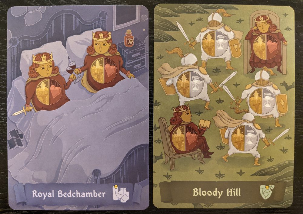 Besides the token placement, you also have to pay careful attention to the locations. Every single location card is unique, whether it is the number of people available or their humours. Because of this setup, it means that every location feels like a puzzle, but a puzzle with many solutions. To give two examples, there are the Royal Bedchambers and the Bloody Hill. The Royal Bedchambers has two nobles, leading to the classic prisoner’s dilemma situation in its purest form. The Bloody Hill? Six people and all of them have yellow humour. The same yellow humour that you remove if there are two or more of them in a single location. Good luck solving that one. I still haven’t figured it out.