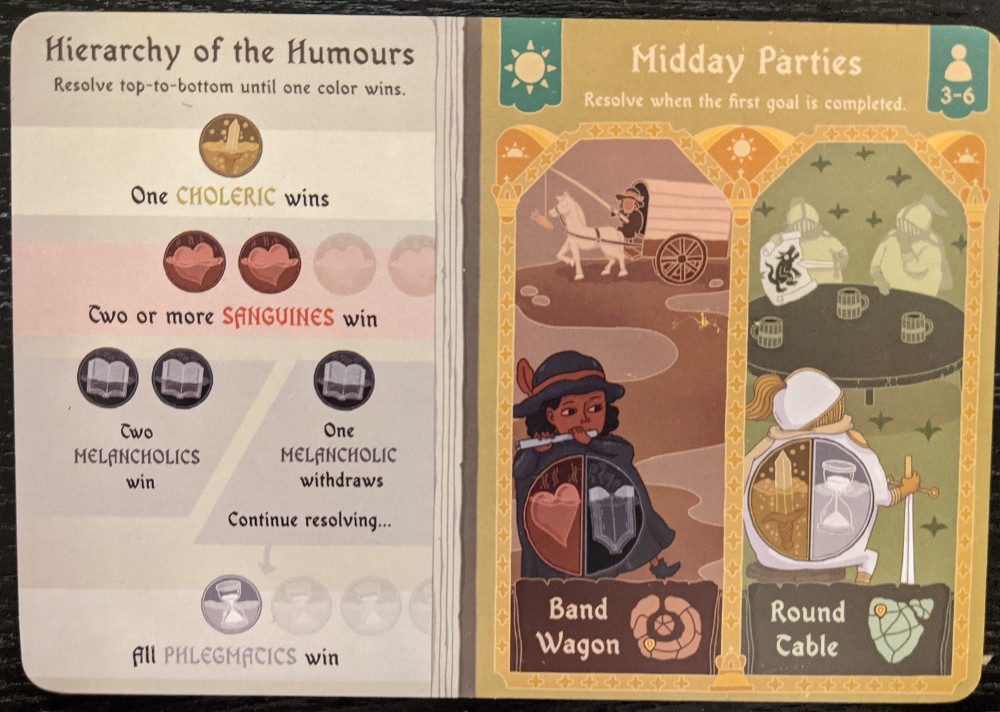 This is not to say that I enjoy downtime. I am not a fan of games with prominent dead air between turns, and Four Humours can sometimes feel like it’s overextending itself. This is more noticeable with higher player counts such as 5 or 6 players. Even if it weren’t for the downtime, the game breaks down if you increase the body count. Since a round ends after filling two cards, the sixth player often has limited options to place their token, so they don’t feel like they are in control of the situation. To be blunt, I almost feel the higher player count is used more for marketing purposes than game design sense.